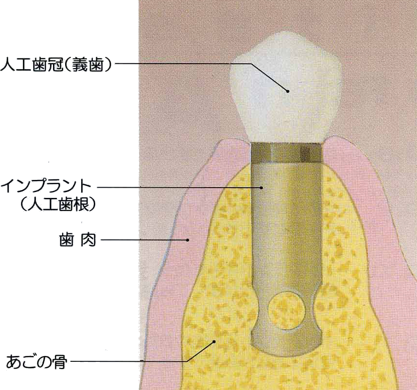 インプラントは、歯の抜けた所に人口の歯根を植え、しっかりと顎(あご)の骨と固定した後、その上に人口の歯を製作し装着する方法です。